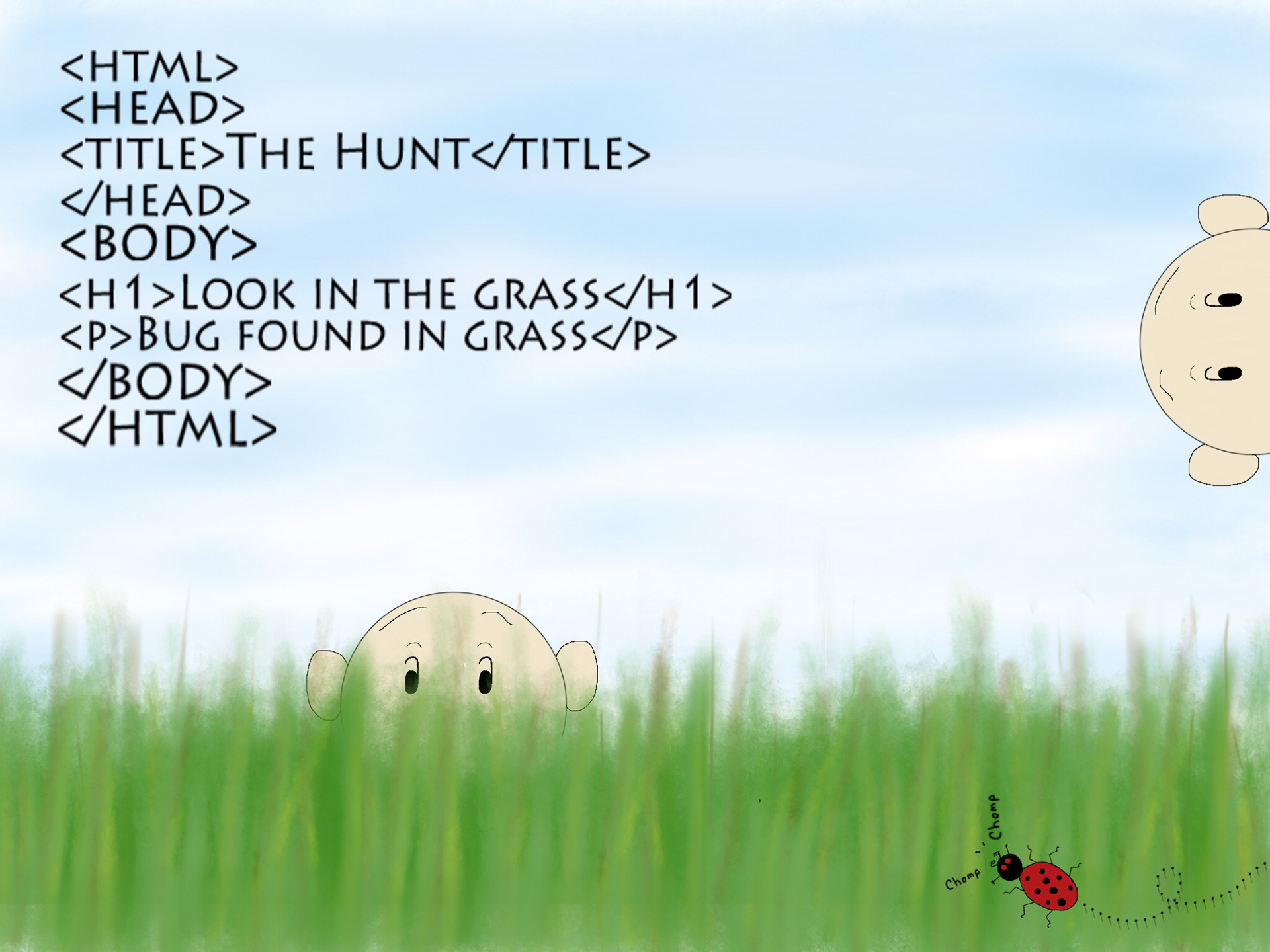 Digitally created rendition of bug hunting with descriptive text displayed as HTML code. Accomplished on an iPad wit Procreate and Photoshop (mobile version).