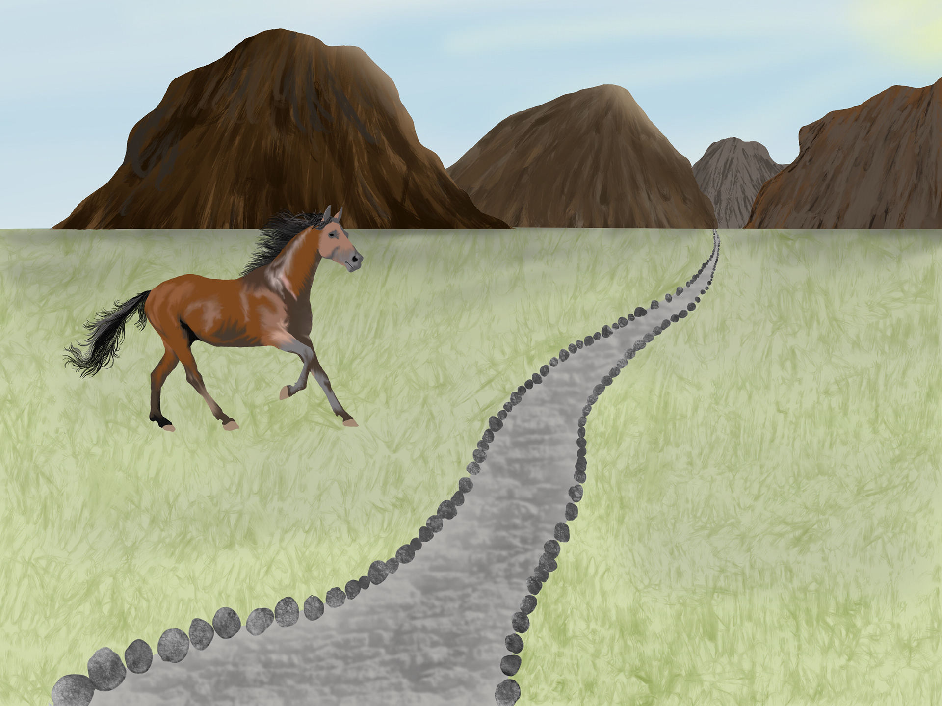 Digital oil painting of horse in mountain scene. One-point perspective.