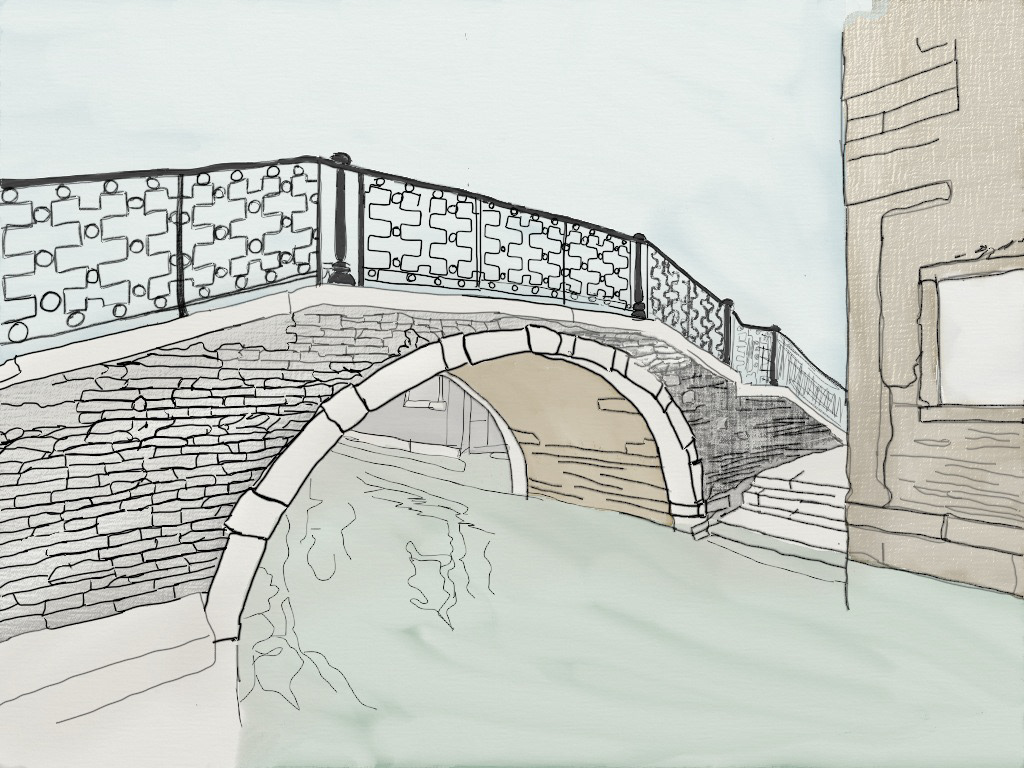 Digital drawing of a Venician scene.